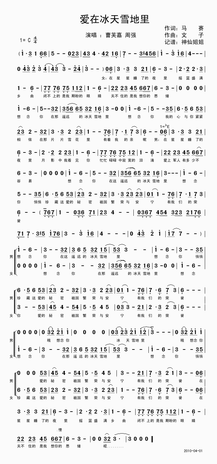 爱在冰天雪地里-曹芙嘉 周强(简谱 歌谱 歌曲简谱 合唱简谱 民歌简谱 影视简谱)