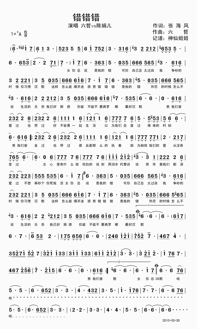 错错错-六哲 陈娟儿(简谱 歌谱 歌曲简谱 合唱简谱 民歌简谱 影视简谱)