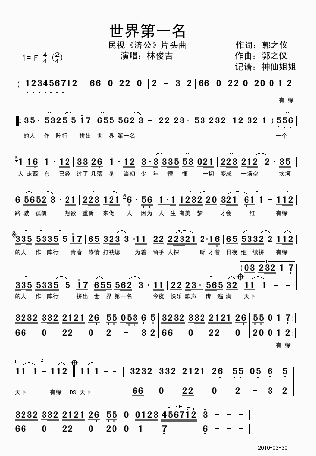 世界第一名-林俊吉(简谱 歌谱 歌曲简谱 合唱简谱 民歌简谱 影视简谱)