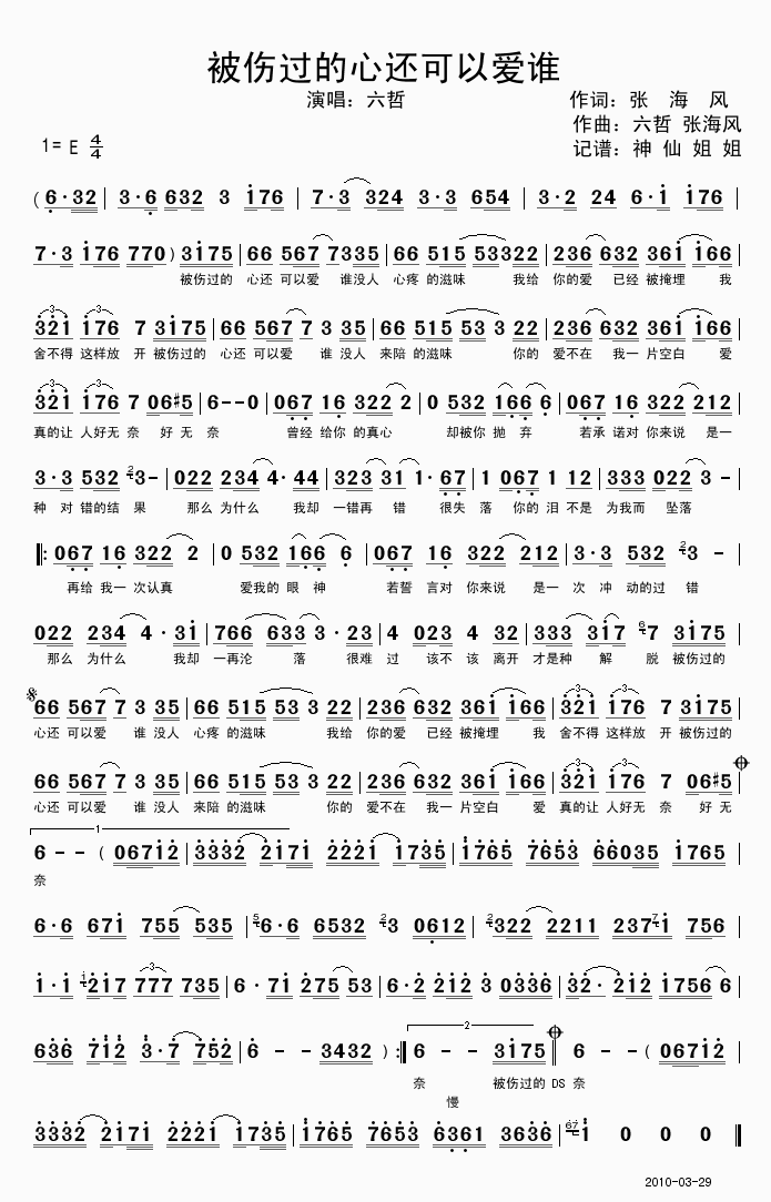 被伤过的心还可以爱谁-六哲(简谱 歌谱 歌曲简谱 合唱简谱 民歌简谱 影视简谱)