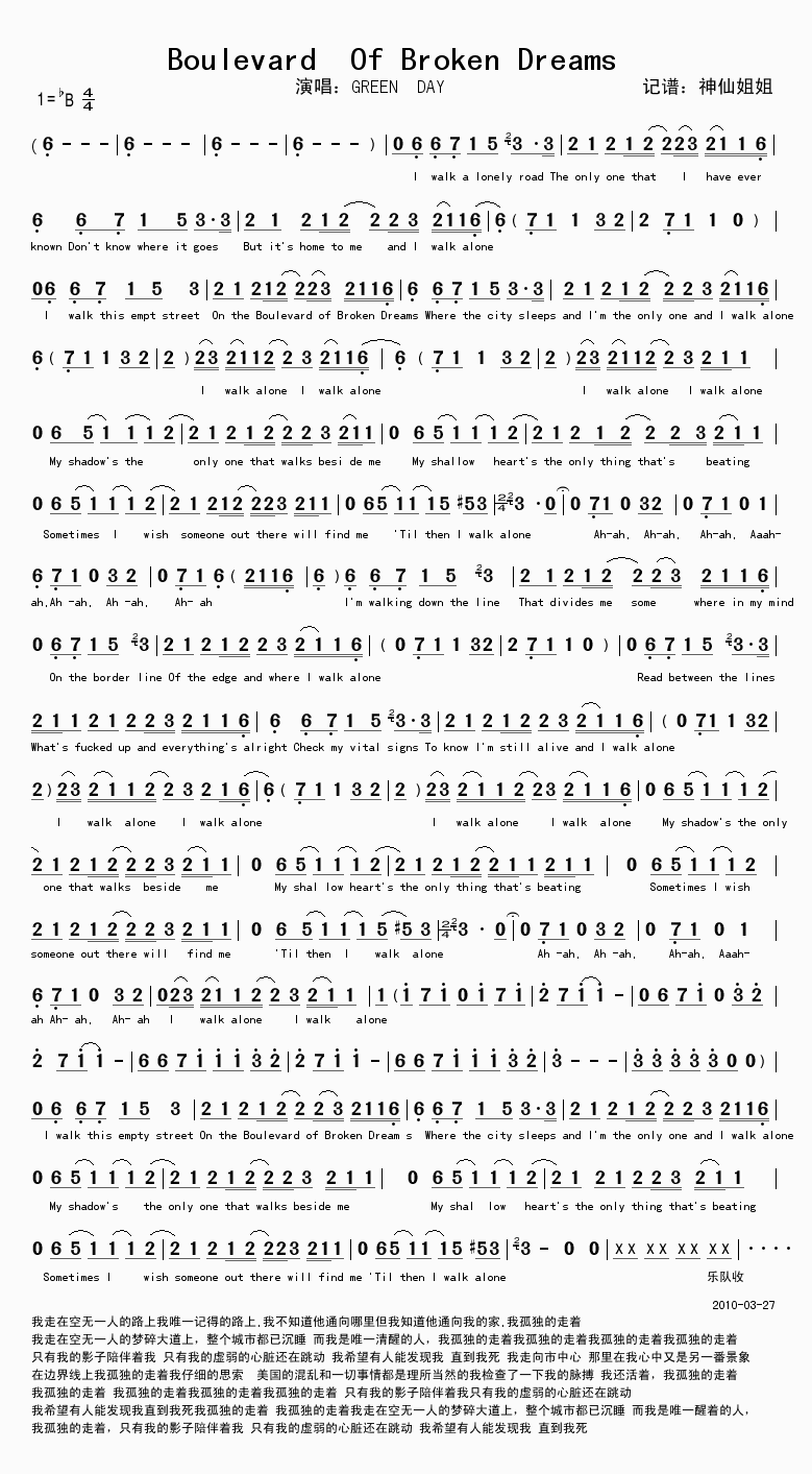 Boulevard Of Broken Dreams-GREEN DAY(简谱 歌谱 歌曲简谱 合唱简谱 民歌简谱 影视简谱 英文歌曲简谱)