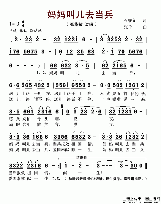 张华敏-妈妈叫儿去当兵(简谱 歌谱 歌曲简谱 合唱简谱 民歌简谱 影视简谱)