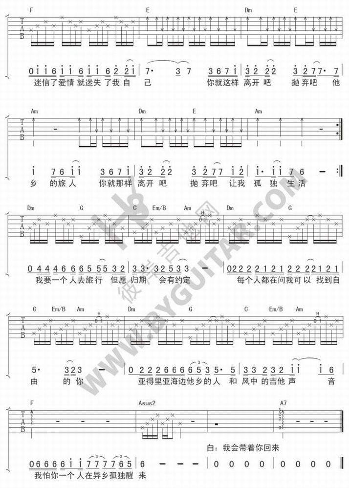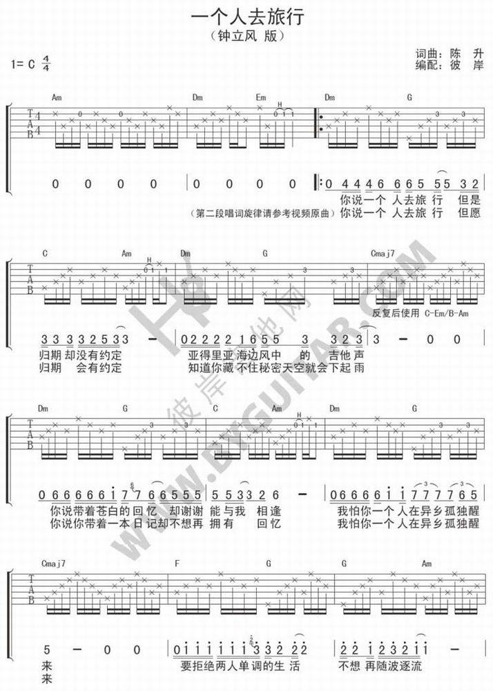 一个人去旅行-钟立风(吉他谱 吉他六线谱 吉他歌谱 吉它谱 影视歌曲吉他谱)