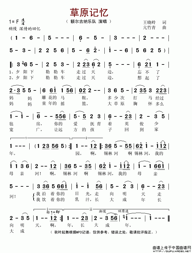 草原记忆-额尔古纳乐队(简谱 歌谱 歌曲简谱 合唱简谱 民歌简谱 影视歌曲简谱)