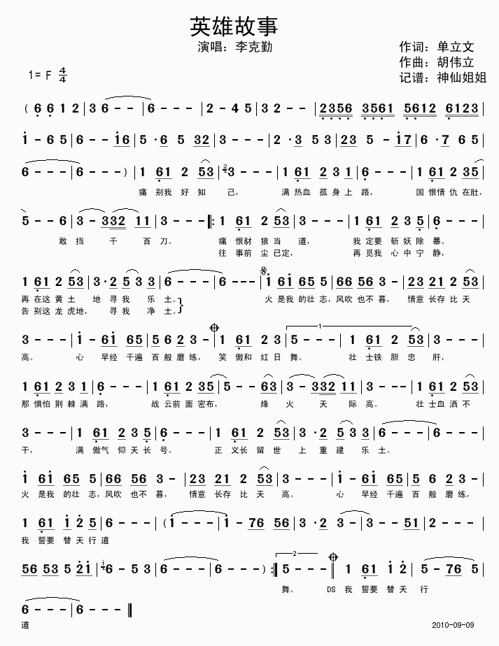 英雄故事-李克勤(简谱 歌谱 歌曲简谱 合唱简谱 民歌简谱 影视歌曲简谱)