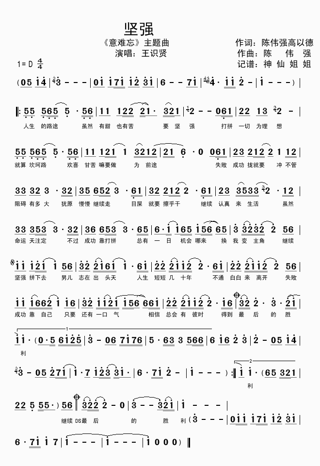 >> 坚强-王识贤(《意难忘》主题曲简谱)