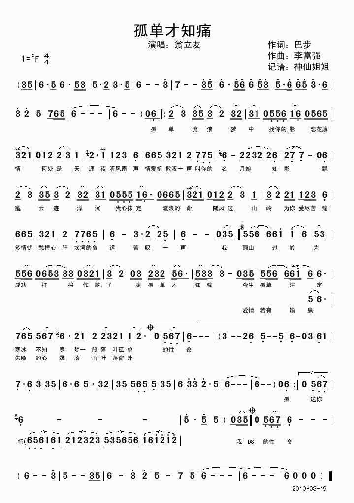 >> 孤单才知痛-翁立友(简谱)