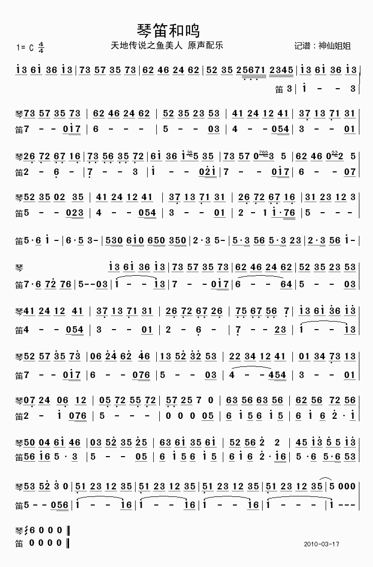 >> 琴笛和鸣-《天地传说之鱼美人》原声音乐简谱