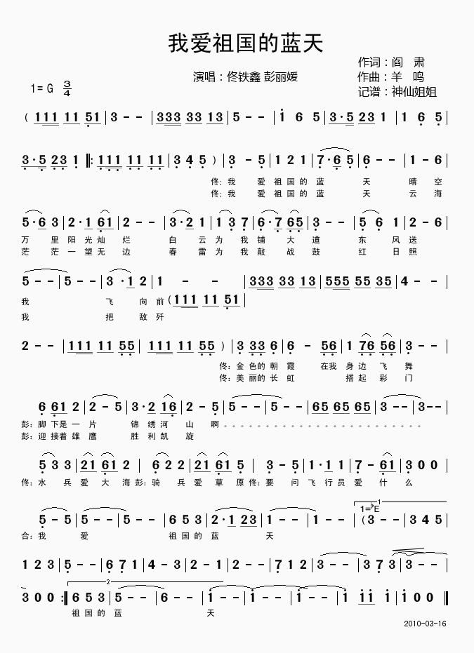 >> 我爱祖国的蓝天-佟铁鑫 彭丽媛(简谱)