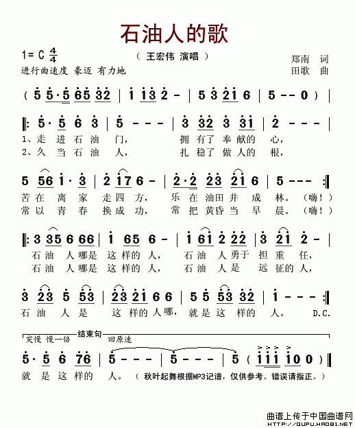 石油人的歌-王宏伟(简谱 歌谱 歌曲简谱 合唱简谱 民歌简谱 影视歌曲简谱)