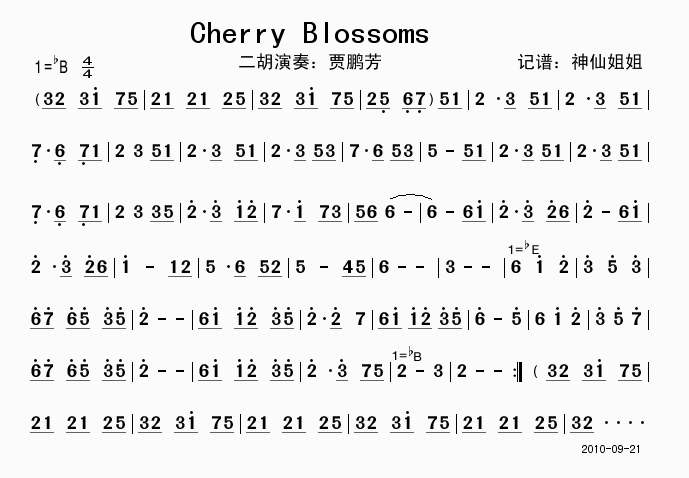 >> Cherry Blossoms-贾鹏芳(二胡曲谱)