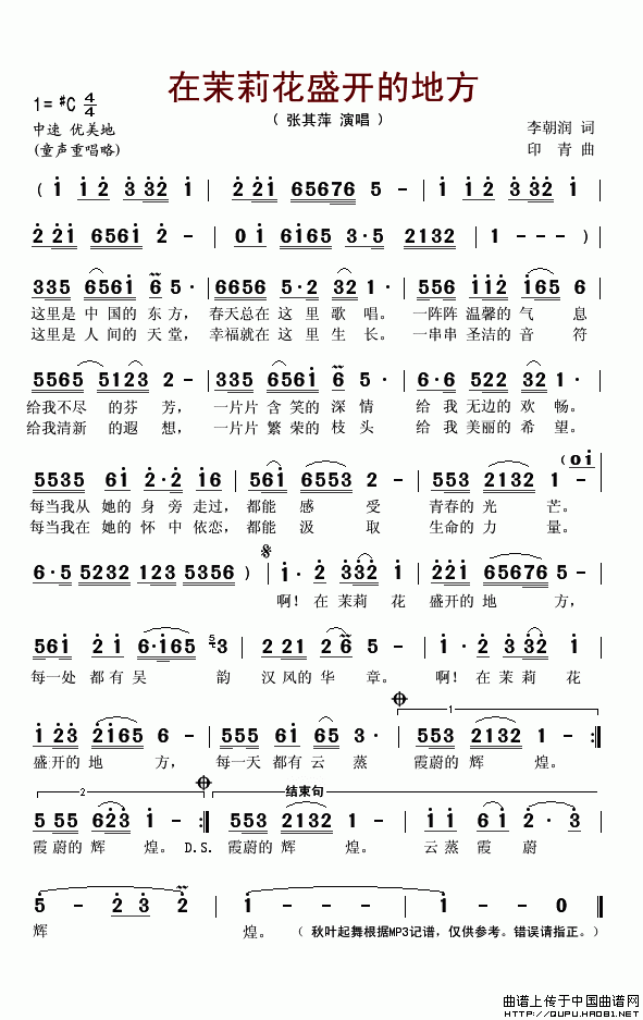 >> 在茉莉花盛开的地方-张其萍(简谱)