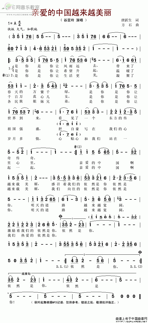 >> 亲爱的中国越来越美丽-谷亚玲(简谱)