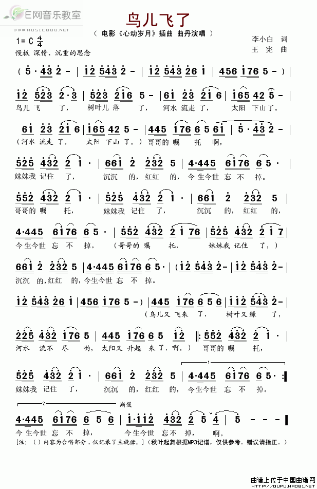 >> 鸟儿飞了-曲丹(电影《心动岁月》插曲简谱)