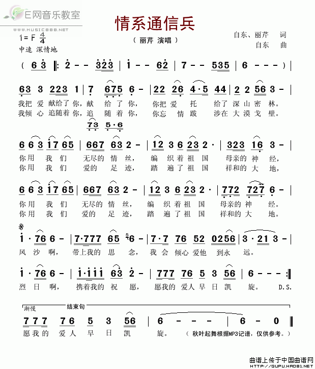我把爱献给了你,献给了你,你把爱托给了深山密林,你用我们无尽的情丝,编织着祖国母亲的神经,你用我们无尽的情丝,编织着祖国母亲的神经,风沙啊,带上我的思念,我会倾心爱他到永远,烈日啊,带上我的祝愿,愿我的爱人早日凯旋。