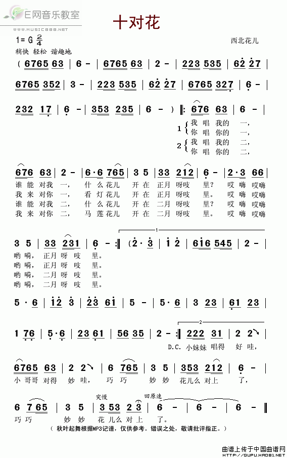 >> 十对花-西北花儿(简谱)