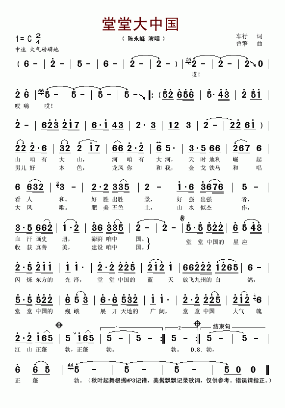>> 堂堂大中国-陈永峰(简谱)