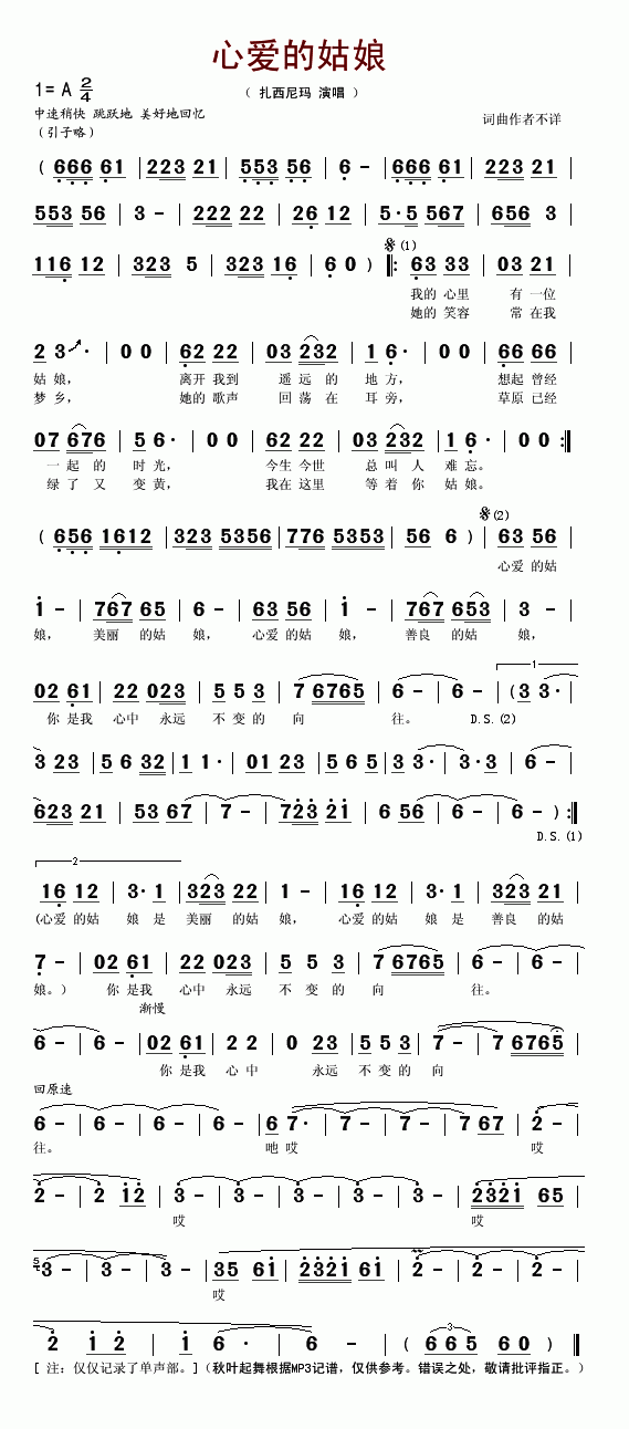 心爱的姑娘-扎西尼玛(简谱)