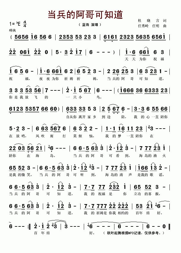 >> 当兵的阿哥可知道-蓝雨(简谱)