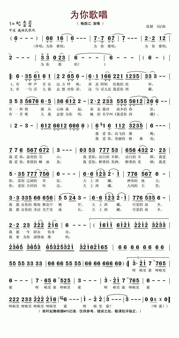 >> 为你歌唱(藏族民歌)-格西江(简谱)
