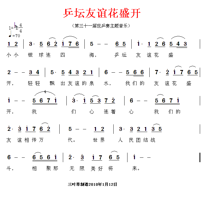 >> 乒坛友谊花盛开-第31届世乒赛主题歌(简谱)