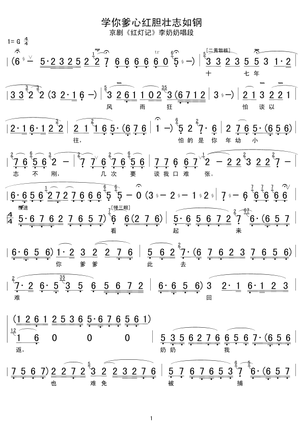 >> 学你爹心红胆壮志如钢-红灯记选段(京剧曲谱)