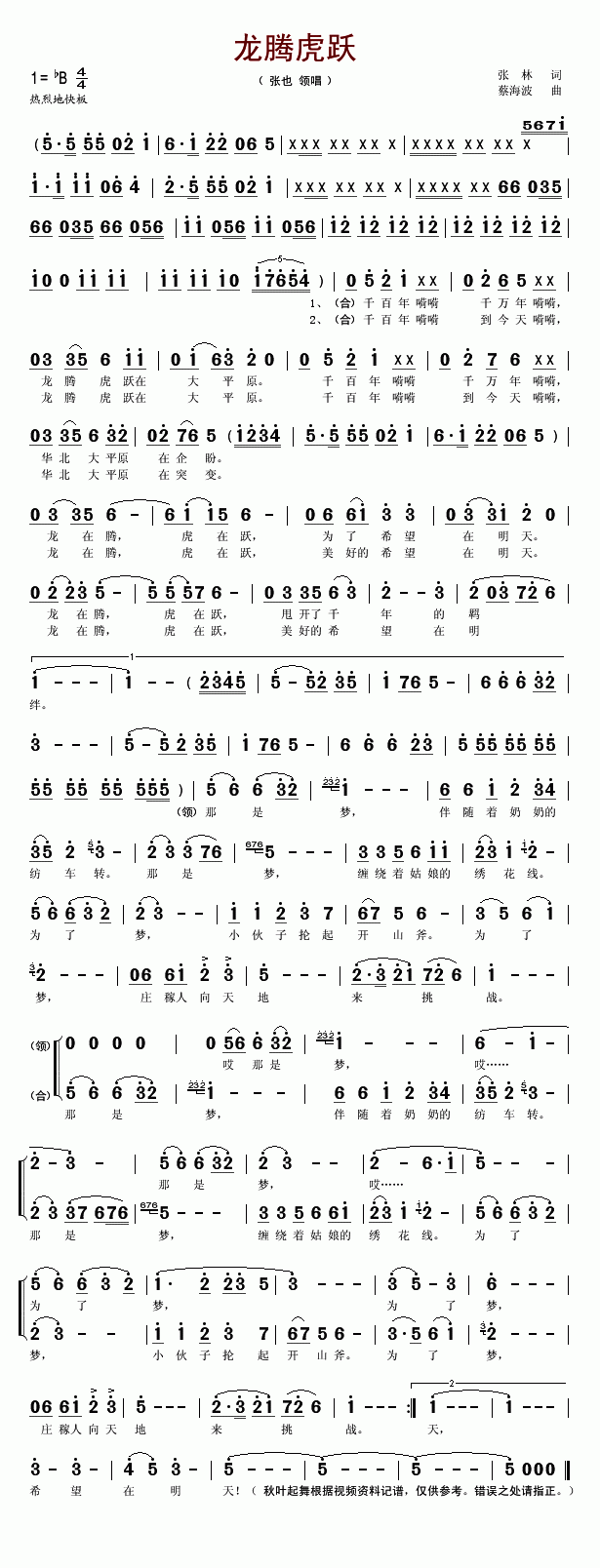 龙腾虎跃-张也领唱(合唱简谱)