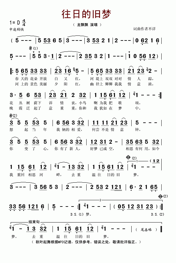 >> 往日的旧梦-龙飘飘(简谱)