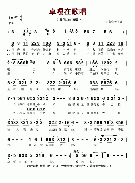 >> 卓嘎在歌唱-贡尕达哇(简谱)