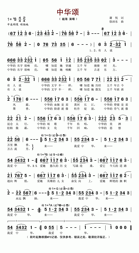 >> 中华颂-祖海(简谱)