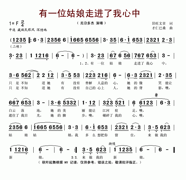 >> 有一位姑娘走进了我心中-尼尕多杰(简谱)