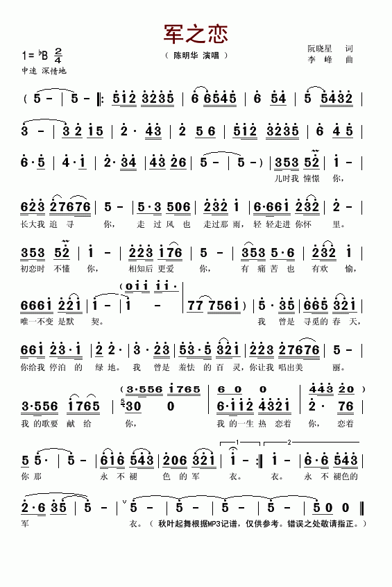 >> 军之恋-陈明华(简谱)