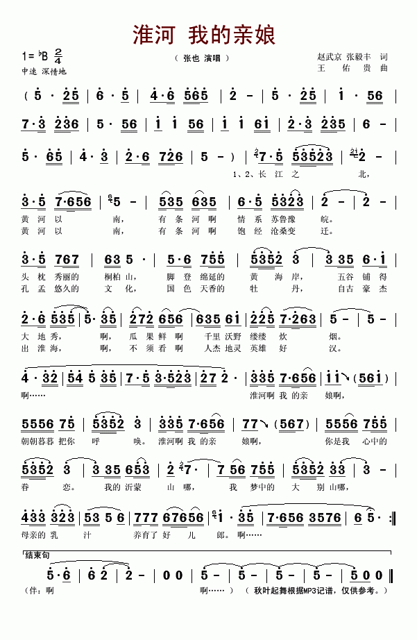 >> 淮河我的亲娘-张也(简谱)