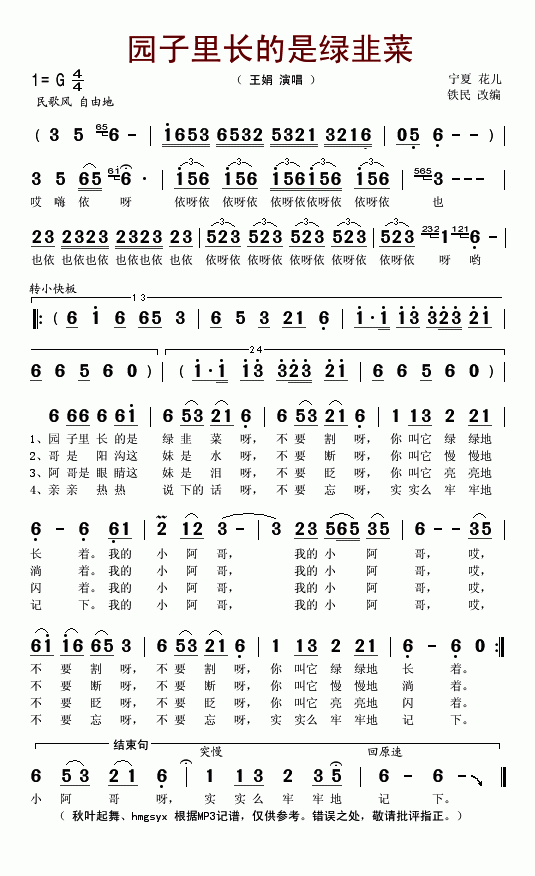 园子里长的绿韭菜-王娟(简谱)