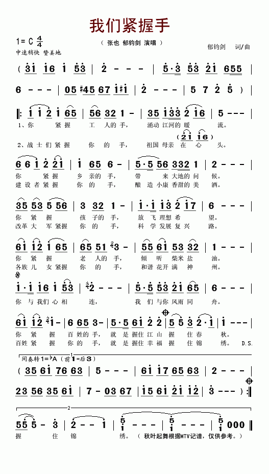 >> 我们紧握手-张也 郁钧剑(简谱)