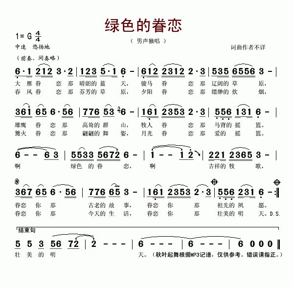 >> 绿色的眷恋-男声独唱(简谱)