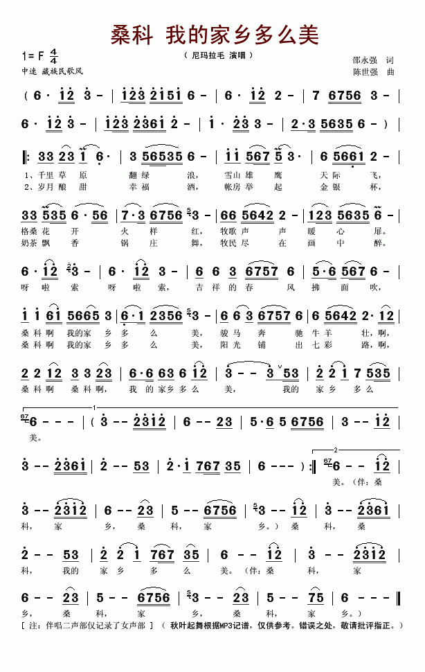 >> 桑科我的家乡多么美-尼玛拉毛(简谱)