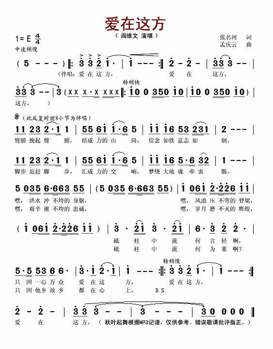 爱在这方-阎维文(简谱)