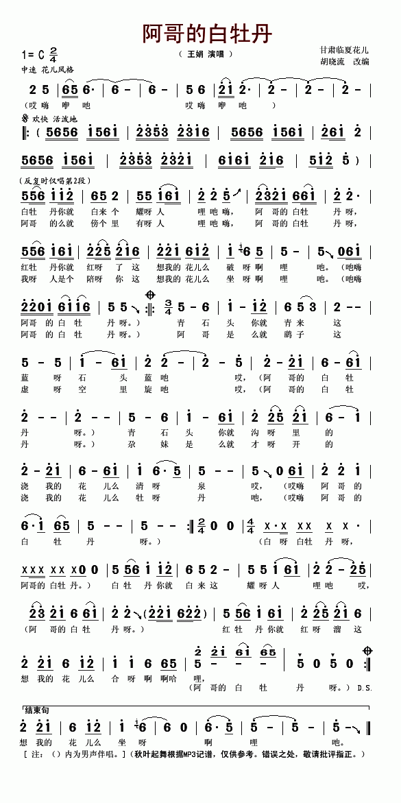 >> 阿哥的白牡丹-王娟(简谱)