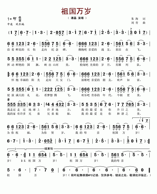 >> 祖国万岁-谭晶(简谱)