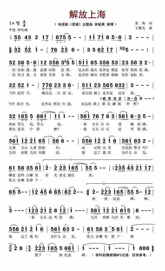 >> 解放上海-宋祖英(电视剧《进城》主题曲简谱)