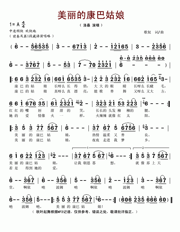 >> 美丽的康巴姑娘-洛桑(简谱)