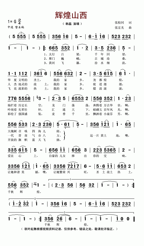 >> 辉煌山西-韩磊(简谱)