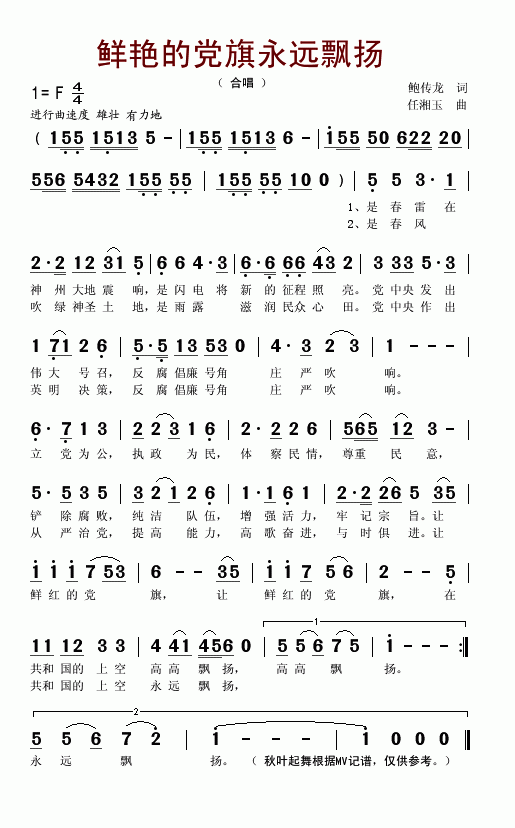 >> 鲜艳的党旗永远飘扬-合唱(简谱)