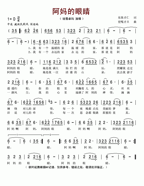 >> 阿妈的眼睛-琼雪卓玛(简谱)