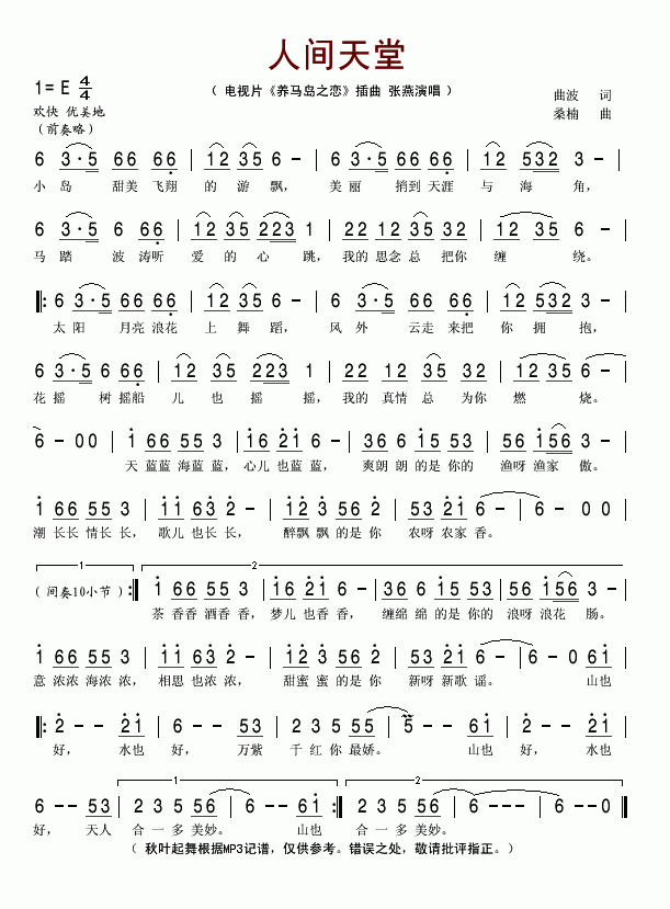 >> 人间天堂-张燕(电视剧《养马岛之恋》插曲简谱)