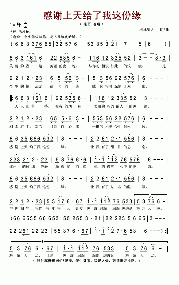 感谢上天给我这份缘-来哥(简谱)