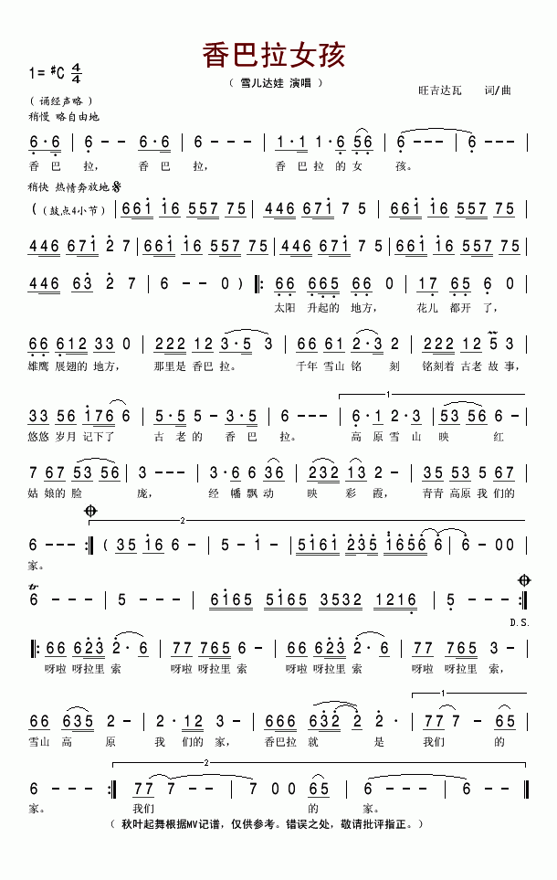 >> 香巴拉女孩-雪儿达娃(简谱)