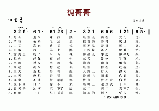 想哥哥-陕西民歌(简谱)
