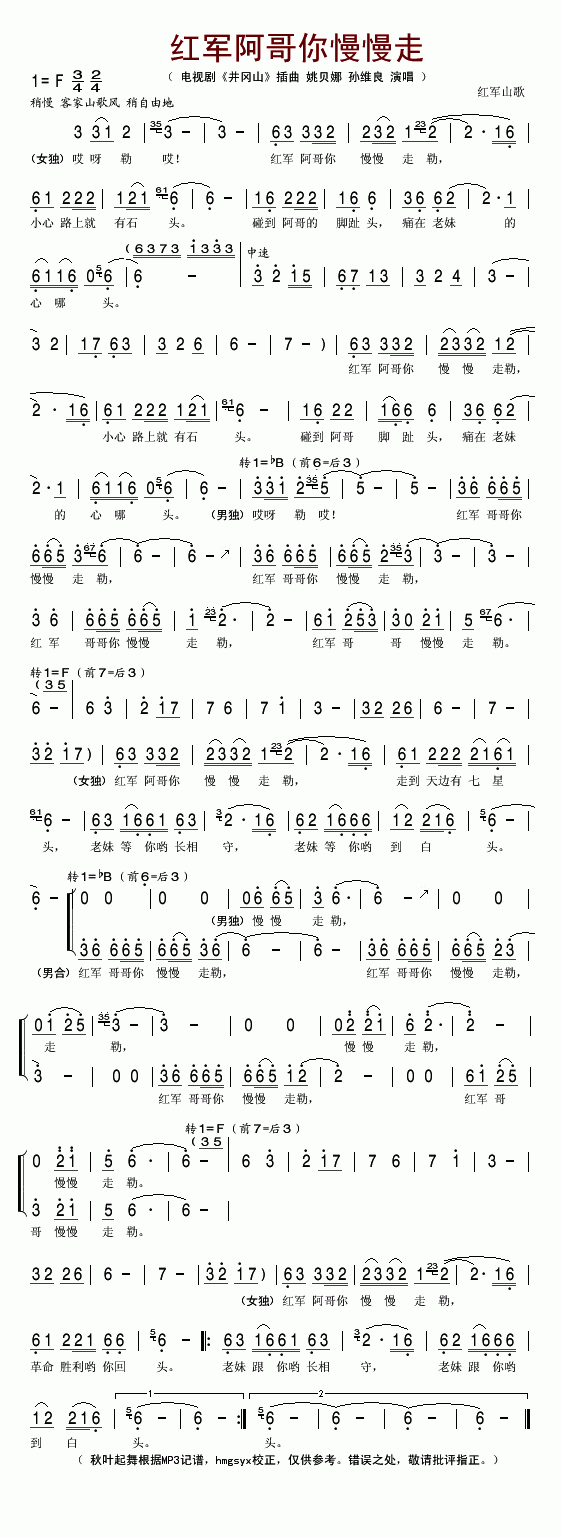 >> 红军阿哥你慢慢走-姚贝娜 孙维良(简谱)